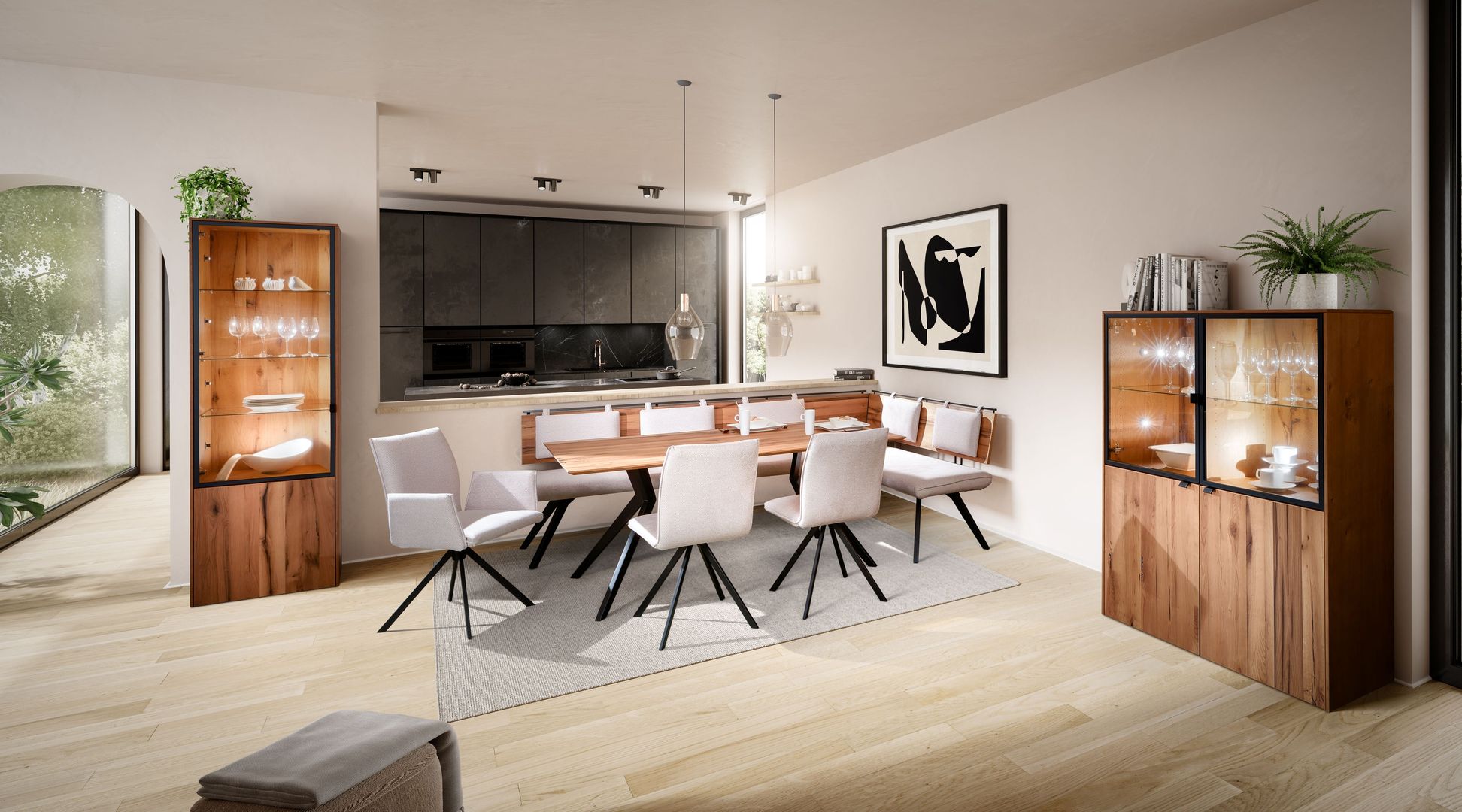 In der neusten Dining-Kollektion „Lassan“ vereinen sich beste Materialien und maßgeschneiderte Designs mit höchstem Sitzkomfort. Dank verschiedener Lehnenvarianten und individuell gestaltbaren Außenseiten lässt sich das Modell perfekt an unterschiedlichste Bedürfnisse anpassen. Ein besonderes Highlight ist die Holzart Kupfereiche, die in zwei Beiztönen erhältlich ist. Mit ihrer warmen, lebendigen Maserung schafft sie eine einladende Atmosphäre – ob in der offenen Wohnküche oder im eleganten Speisezimmer.