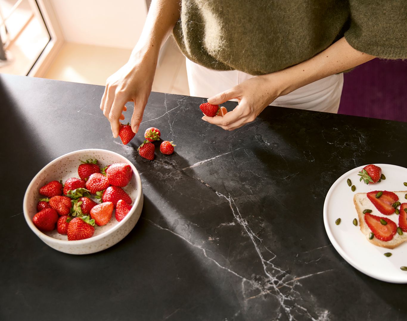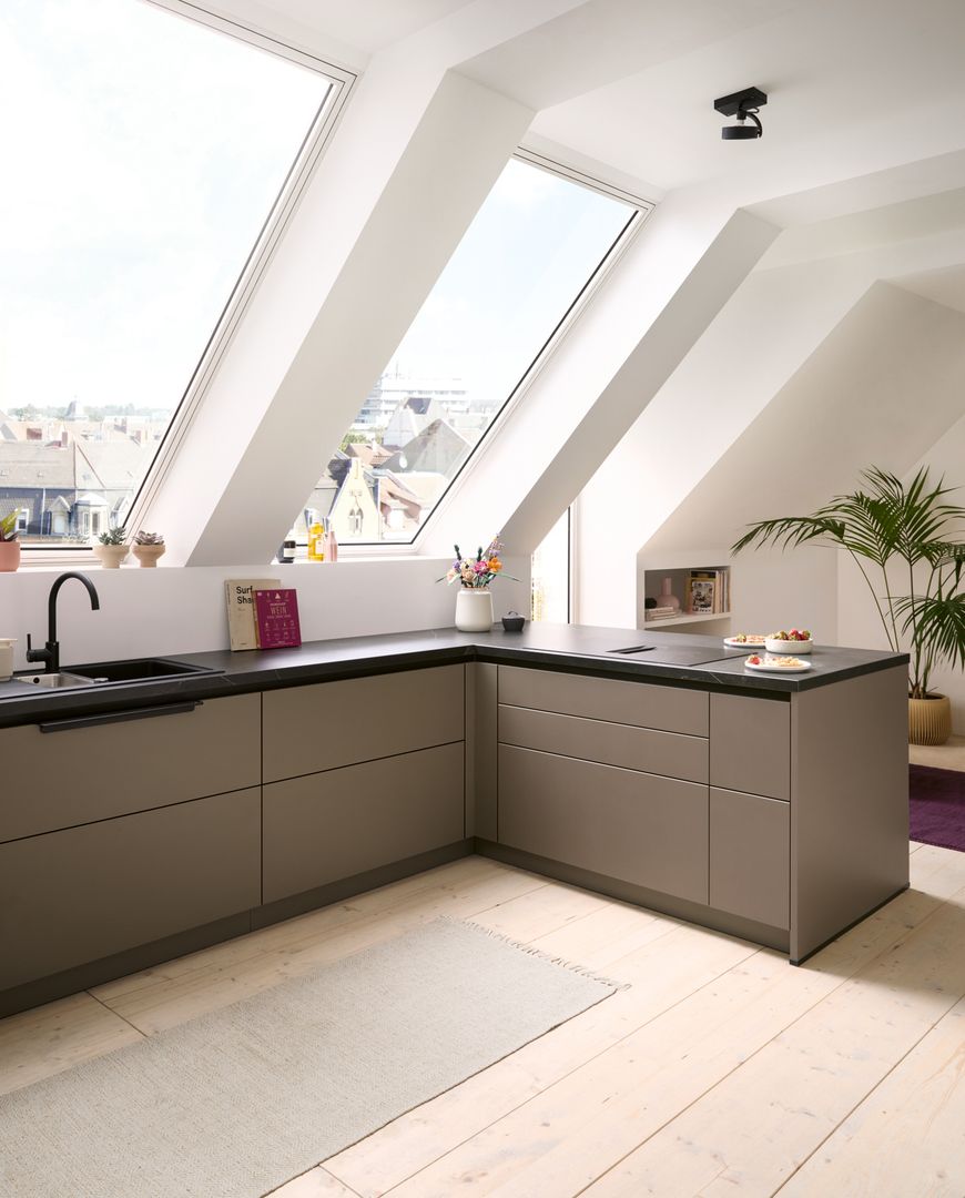 Die wandhängenden Schränke in warmem Sepiabraun schaffen eine leichte Atmosphäre und bieten ausreichend Stauraum. Mit dem Blick über die Stadt im Apartment mit Dachschräge duftet es morgens nach Kaffee – zubereitet auf der dunkel, edlen Arbeitsplatte in Marmor nero Nachbildung in einer Kaffeetasse aus dem Regal mit Glasschiebetür. Offenheit und Leichtigkeit strahlt die schräg eingepasste Küche aus und lädt zu spannenden Gesprächen um die Küchen-Halbinsel herum ein. Durch die Tip-On-Mechanik lassen sich Auszüge und Türen auch mit vollen Händen öffnen – das Highlight: die nachhaltige Front in Matera Colour mit Anti-Fingerprint-Eigenschaft hinterlässt keine Spuren vom Öffnen oder Schließen der Schränke.