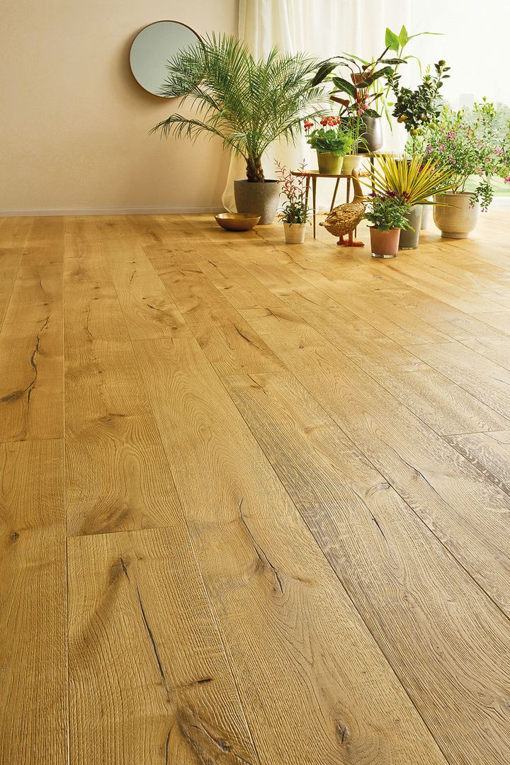 Die sehr beliebten Eichenböden sind durch die enorme Härte des Holzes besonders langlebig und halten einiges aus. Spielende Kinder, Haustiere und schmutzige Schuhe – alles kein Problem für diese Dauerbrenner-Böden! Einfach feucht wischen oder kehren – und der Boden glänzt in unverminderter Schönheit! Der Vorteil der Reliefoptik von gehobelten oder gealterten Dielen ist die Strapazierfähigkeit, da sich Kratzer oder sonstige kleine Gebrauchsspuren in die bestehende Gestaltung integrieren – und diese Böden auch nach vielen Jahren noch wie neu erscheinen.