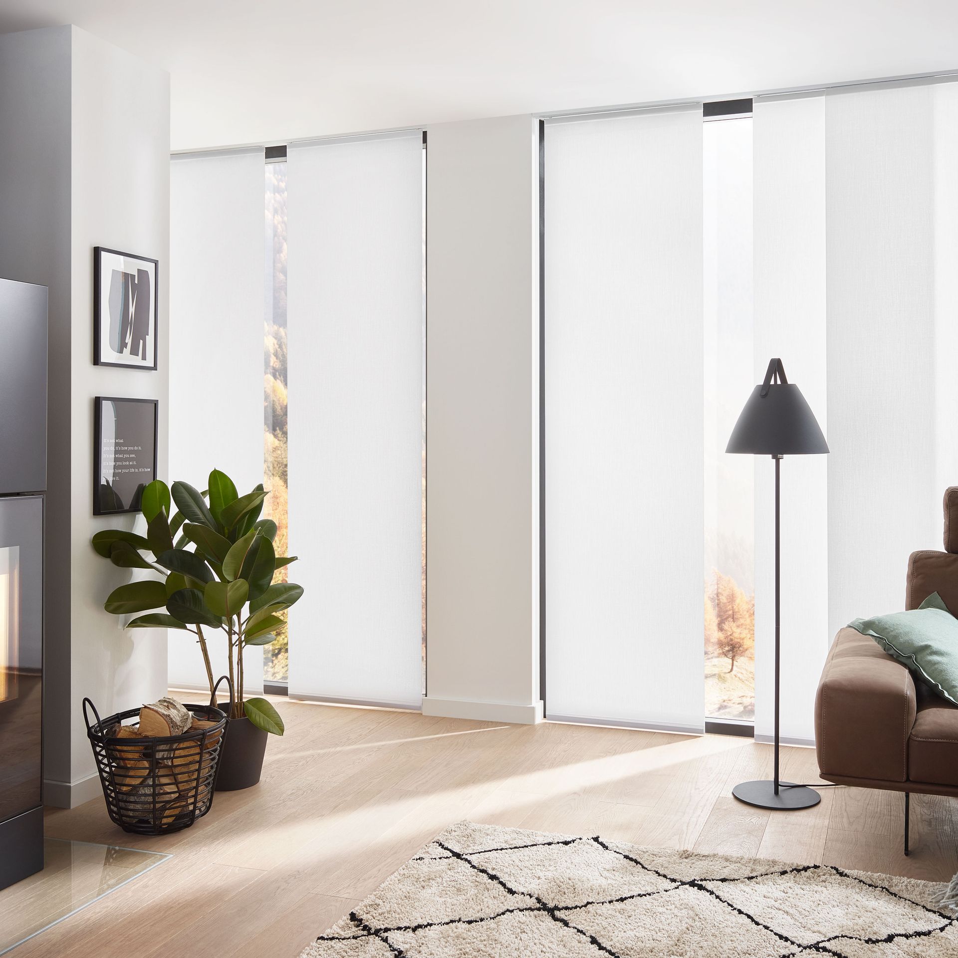 Die Paneele sind in individuellen Größen und praktisch unendlich vielen verschiedenen Stoffdesigns erhältlich. Die Paneele lassen sich einfach abnehmen und austauschen (Befestigung mittels Klettband). Die Montage der Schiebevorhänge erfolgt wahlweise an Wand oder Decke. Besonders für große Fenster, Glasfronten oder als Raumteiler bestechen Flächenvorhänge mit ihrer modernen, reduzierten Formensprache.