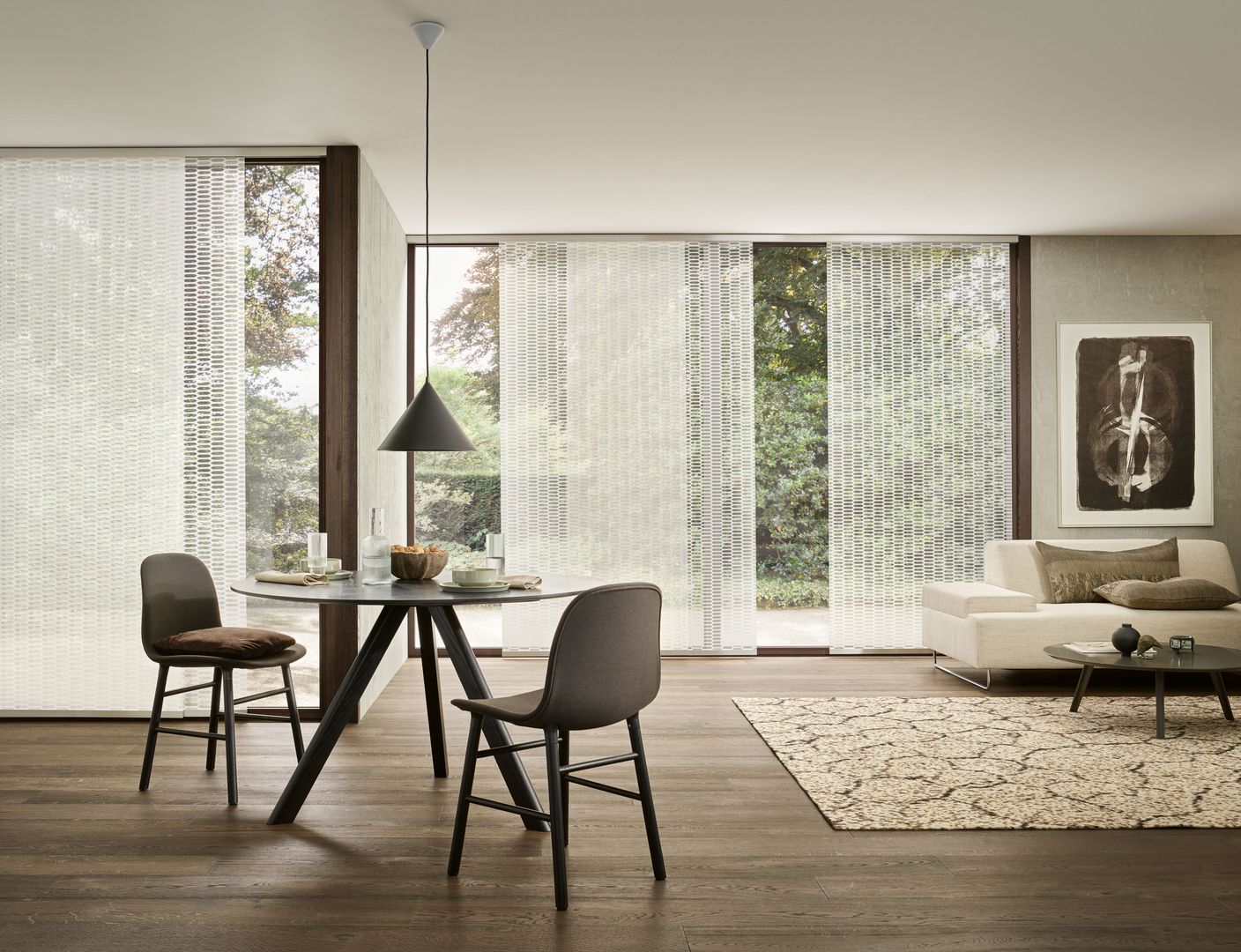 Wie sieht der Vorhang 2.0 aus? Man könnte auch sagen: Innovative Formensprache. Traditionelle Idee. Weniger ist einfach mehr beim Flächenvorhang. Denn er integriert sich perfekt in avantgardistische Architekturkonzepte, macht sich nicht wichtiger als er ist – und kann gleichzeitig als moderne Wand- und Frontgestaltung ein wichtiges Gestaltungselement mit paralleler Beschattungsfunktion darstellen. Beim Flächenvorhang werden großflächige Stoffpaneele exakt nach Ihren Wünschen gestaltet und in leichtgängigen Schienen in verschiedenen Materialien und Gestaltungsvarianten montiert. Diese Paneele lassen sich dank des Schiebesystems beliebig stufenlos seitlich verschieben und hintereinander stapeln. Ein abwechslungsreiches Spiel mit Licht, Schatten, Ein- und Ausblicken ist garantiert!