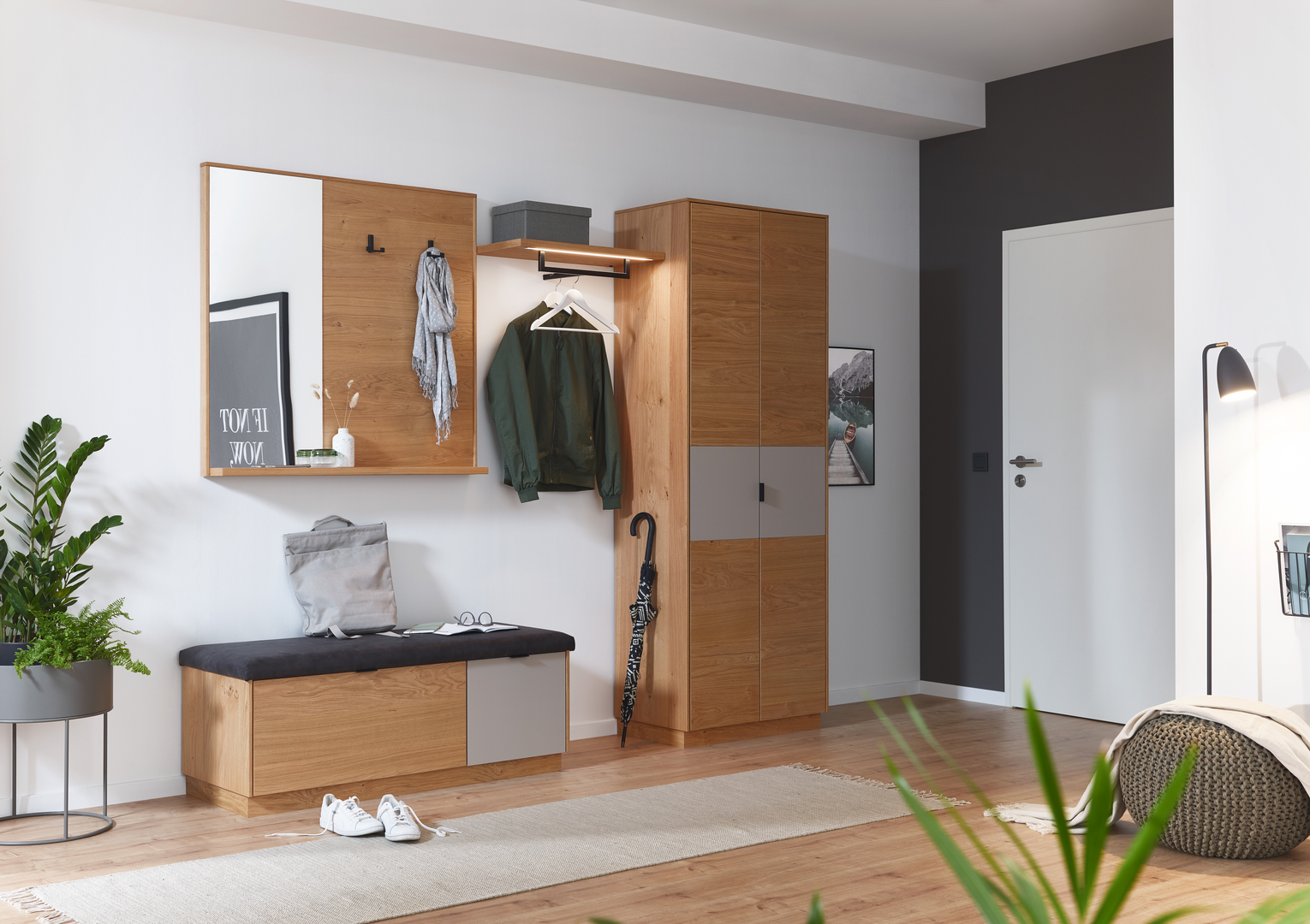 Als Visitenkarten für die eigenen 4 Wände vermittelt der Garderobenbereich den Designeinstieg in Ihre Wohnung. Außerdem bietet er Stauraum für alles, was man beim Kommen und Gehen so braucht. Von den Gummistiefeln bis zur Hutablage. Die Handtaschen, Mäntel, Mützen und viele weitere Accessoires nicht zu vergessen.